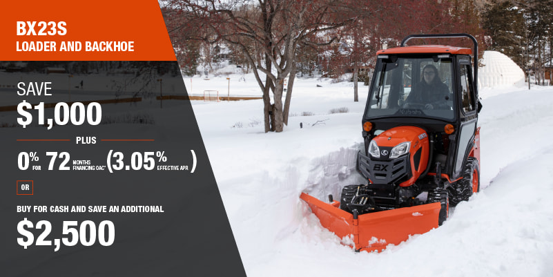 Discount shown available on a new and previously unregistered BX23S is $1,000.00. Offer cannot be applied on past transactions, and has no cash surrender value. Representative finance example for the BX23SLBB-T-1: $35,233.07 financed at 0% (3.05% effective APR which factors in $1,000.00 in stackable cash, plus $2,748.18 in non stackable cash that cannot be combined with finance offers) equals $203.27 bi-weekly for 72 months. 156 payments required bi-weekly for 72 months. $3,523.31 down payment required. Cost of borrowing is $2,748.18 for a total obligation of $35,233.07. Financing available on approved credit. Prices and payments include freight and other applicable fees (including environmental fees, administration fees, set-up fees, and dealer fees on the model specified). Rebate of $2,500 available on cash purchases of a new BX23S only. Offer valid until 01-12-2026.