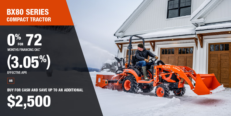 Representative finance example for the BX1880V-1: $15,780.50 financed at 0% (3.05% effective APR which factors in $1,230.88 in non stackable cash that cannot be combined with finance offers) equals $91.04 bi-weekly for 72 months. 156 payments required bi-weekly for 72 months. $1,578.05 down payment required. Cost of borrowing is $1,230.88 for a total obligation of $15,780.50. Financing available on approved credit. Prices and payments include freight and other applicable fees (including environmental fees, administration fees, set-up fees, and dealer fees on the model specified). Rebate of $2,500 available on cash purchases of a new BX23S only. Rebate of $1,500 available on cash purchases of all other models. Offer valid until 01-12-2026.
