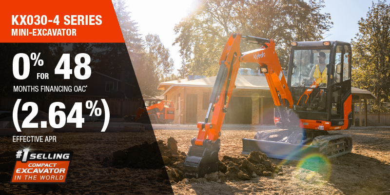 Representative finance example for the KX030-4: $66,597.33 financed at 0% (2.64% effective APR which factors in $3,116.76 in non stackable cash that cannot be combined with finance offers) equals $1248.7 monthly for 48 months. $6,659.73 down payment required. Cost of borrowing is $3,116.76 for a total obligation of $66,597.33. Financing available on approved credit. Prices and payments include freight and other applicable fees (including environmental fees, administration fees, set-up fees, and dealer fees on the model specified). Excavator Claim: "Kubota is the world’s #1 selling compact excavator for 20 years." Disclaimer: According to 2023 data from Off-Highway Research including all Kubota Group brand sales. Offer valid until 01-12-2026.