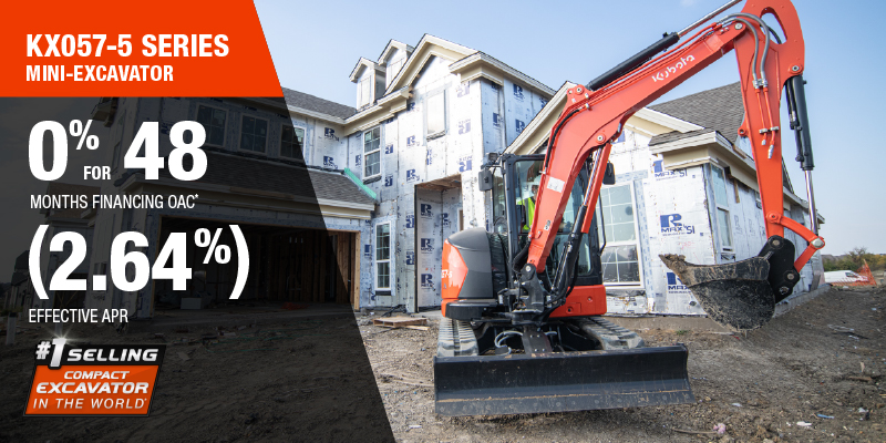Representative finance example for the KX057-5: $118,641.26 financed at 0% (2.64% effective APR which factors in $5,552.41 in non stackable cash that cannot be combined with finance offers) equals $2224.52 monthly for 48 months. $11,864.13 down payment required. Cost of borrowing is $5,552.41 for a total obligation of $118,641.26. Financing available on approved credit. Prices and payments include freight and other applicable fees (including environmental fees, administration fees, set-up fees, and dealer fees on the model specified). Excavator Claim: "Kubota is the world’s #1 selling compact excavator for 20 years." Disclaimer: According to 2023 data from Off-Highway Research including all Kubota Group brand sales. Offer valid until 01-12-2026.