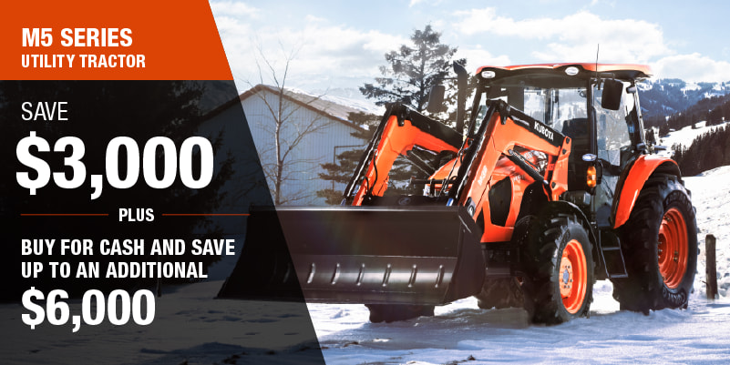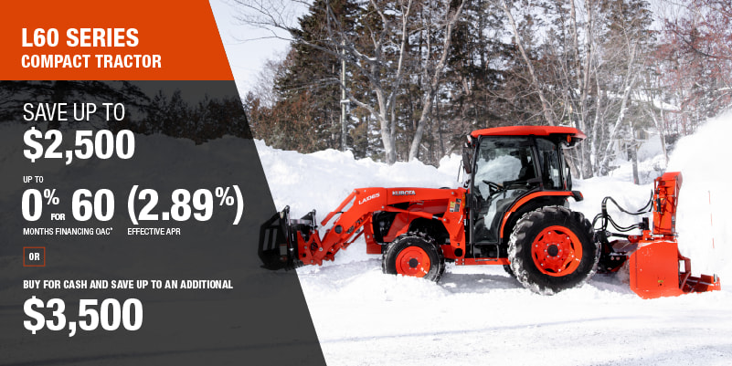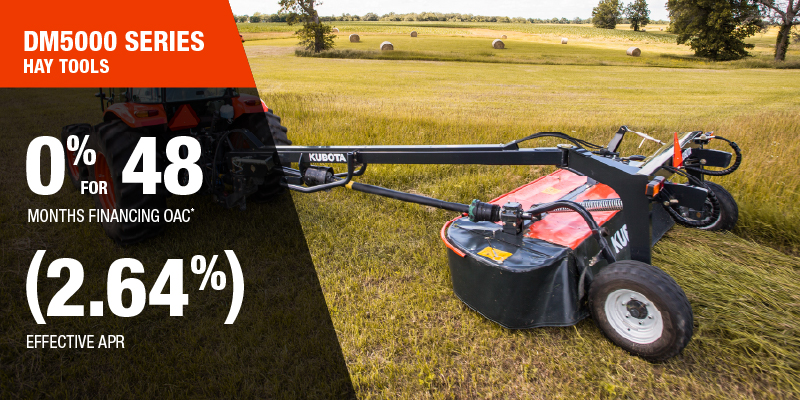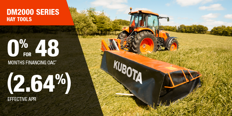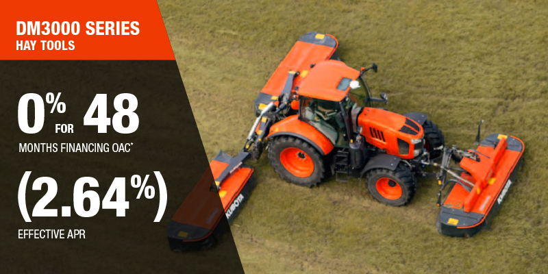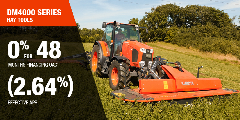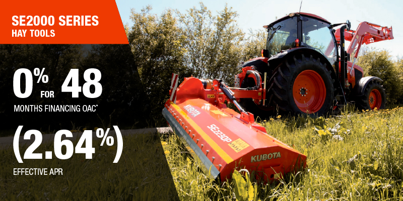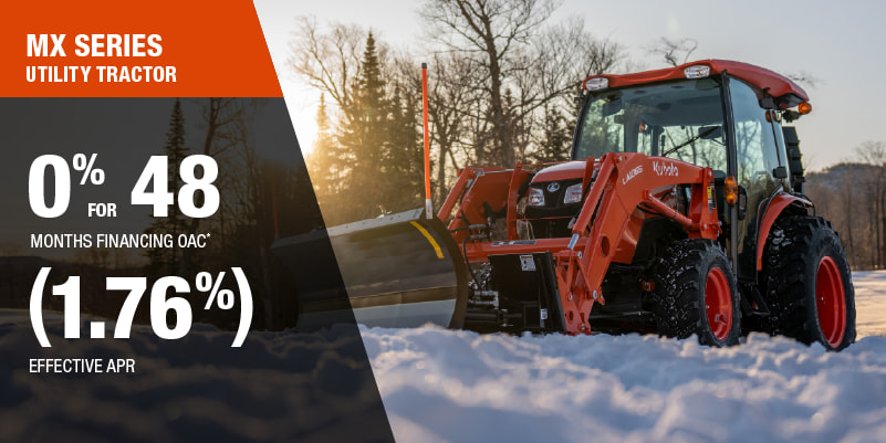 *For all offers: Prices and payments include freight and other applicable fees (including environmental fees, administration fees, set-up fees, and dealer fees). Taxes, delivery fees, insurance and registration are extra. Dealer may sell for less. Dealer order/trade may be necessary (but may not be available in all cases). Some restrictions apply. Offers valid only at participating dealers in Canada and are subject to change, cancellation or extension at any time without notice or obligation. Minimum down payment of 10% required for financing offers on turf and agricultural products. Specifications, features, illustrations and equipment shown are based on the latest available information at the time of publication. Some models are shown with optional accessories available at extra cost. Although descriptions are believed to be correct, accuracy cannot be guaranteed. We reserve the right to make changes at any time, without notice or obligation to specifications, accessories, materials, models, prices, payments and other information. Offer valid until January 12, 2026. See your participating Kubota dealer or visit www.kubota.ca for complete details.
