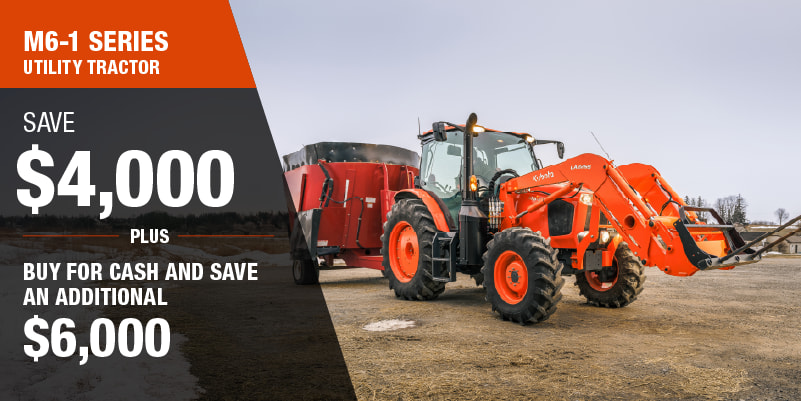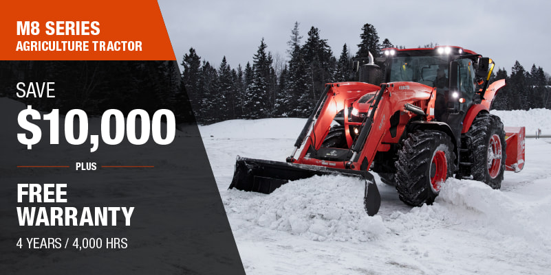 Discount shown available on a new and previously unregistered M8 is $10000.00. Offer cannot be applied on past transactions, and has no cash surrender value. The 4 year/4,000h warranty on M8 offer is only valid in Canada on products distributed by Kubota Canada Ltd. Discount(s) apply before tax. Offer cannot be applied on past transactions, and has no cash surrender value. Offer valid until 01-12-2026.