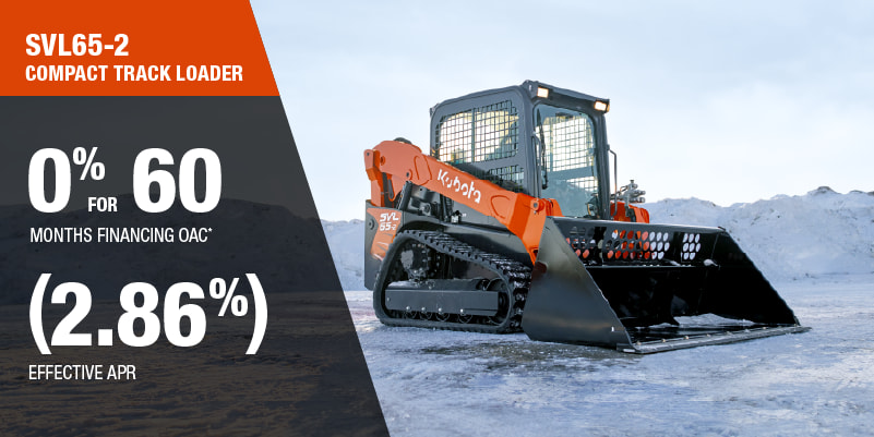 Representative finance example for the SVL65-2: $95,275.17 financed at 0% (2.86% effective APR which factors in $5,945.17 in non stackable cash that cannot be combined with finance offers) equals $1429.13 monthly for 60 months. $9,527.52 down payment required. Cost of borrowing is $5,945.17 for a total obligation of $95,275.17. Financing available on approved credit. Prices and payments include freight and other applicable fees (including environmental fees, administration fees, set-up fees, and dealer fees on the model specified). 0% for 60 months available only on SVL65-2 models Offer valid until 01-12-2026.
