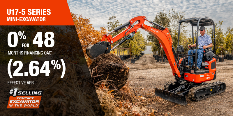 Representative finance example for the U17-5: $50,446.13 financed at 0% (2.64% effective APR which factors in $2,360.88 in non stackable cash that cannot be combined with finance offers) equals $945.86 monthly for 48 months. $5,044.61 down payment required. Cost of borrowing is $2,360.88 for a total obligation of $50,446.13. Financing available on approved credit. Prices and payments include freight and other applicable fees (including environmental fees, administration fees, set-up fees, and dealer fees on the model specified). Excavator Claim: "Kubota is the world’s #1 selling compact excavator for 20 years." Disclaimer: According to 2023 data from Off-Highway Research including all Kubota Group brand sales. Offer valid until 01-12-2026.