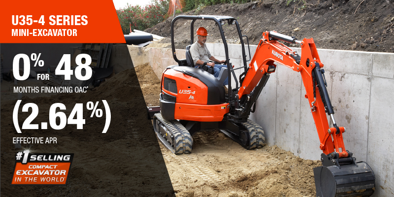 Representative finance example for the U35-4: $85,546.39 financed at 0% (2.64% effective APR which factors in $4,003.57 in non stackable cash that cannot be combined with finance offers) equals $1603.99 monthly for 48 months. $8,554.64 down payment required. Cost of borrowing is $4,003.57 for a total obligation of $85,546.39. Financing available on approved credit. Prices and payments include freight and other applicable fees (including environmental fees, administration fees, set-up fees, and dealer fees on the model specified). Excavator Claim: "Kubota is the world’s #1 selling compact excavator for 20 years." Disclaimer: According to 2023 data from Off-Highway Research including all Kubota Group brand sales. Offer valid until 01-12-2026.