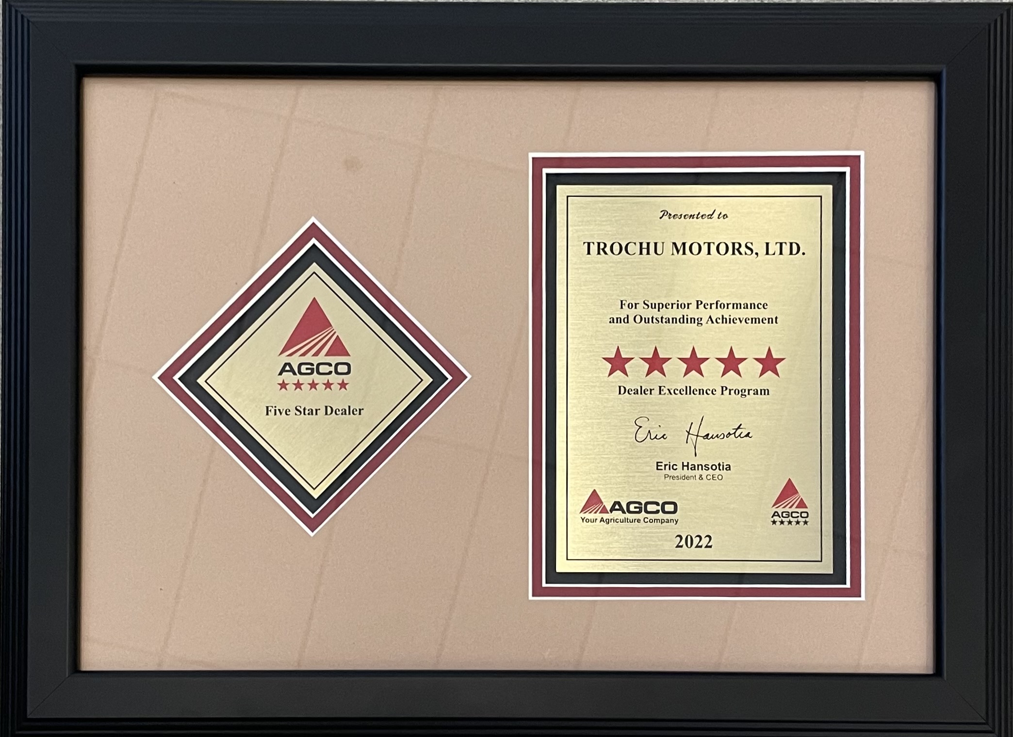 Trochu Motors was honored to receive the Five-Star Dealer Excellence award from AGCO in 2020, 2022 and 2023. This award recognizes dealerships for their investment in training, customer service, and business partnership with AGCO.